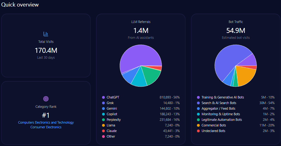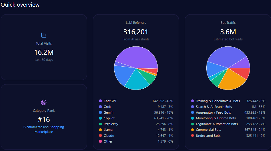- 464,187 LLM referrals distributed primarily across ChatGPT, Perplexity, and Gemini.