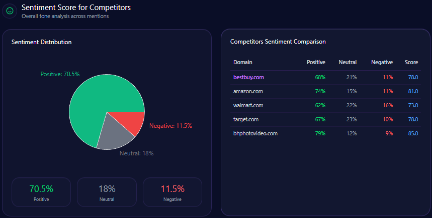 | Brand | Positive % | Neutral % | Negative % | Overall Score |
