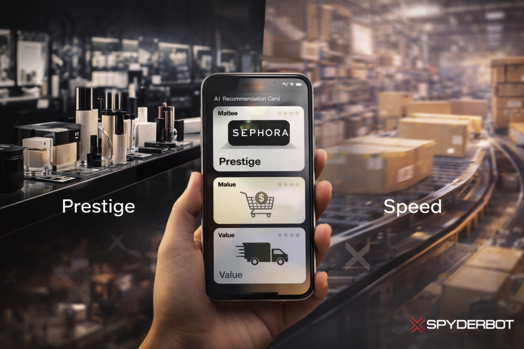 SpyderBot GEO analytics reveals Sephora’s commanding presence in luxury skincare and prestige beauty LLM responses, alongside vulnerabilities in budget makeup and delivery-related queries dominated by Amazon and Ulta Beauty.