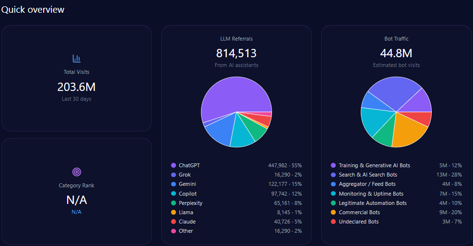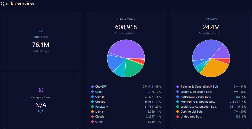 • 76,114,807 total visits with 24,356,738 attributed to bot traffic including 3,410,143 training and generative AI bots.