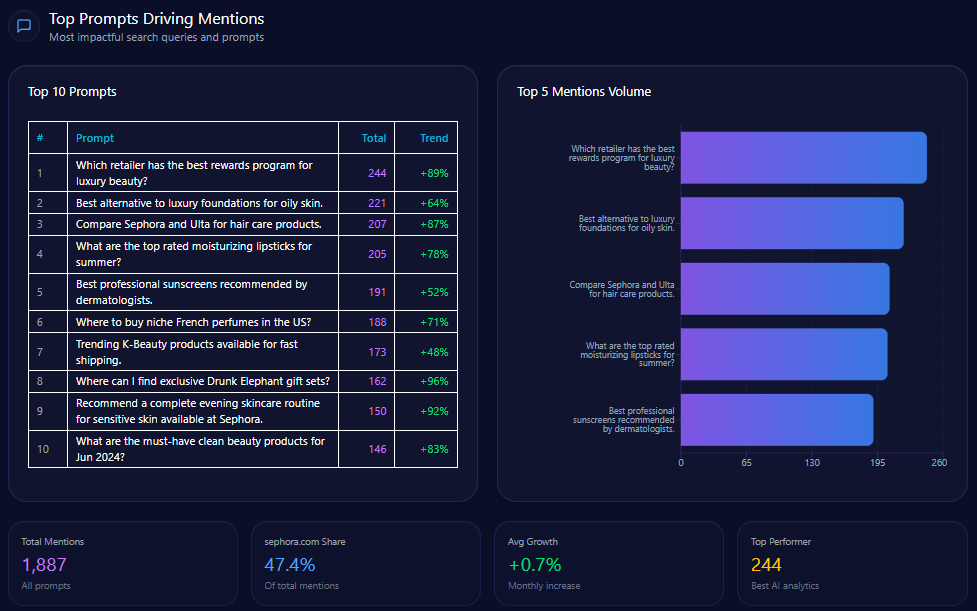 • The leading query, “Which retailer has the best rewards program for luxury beauty?” accounts for 244 mentions, with Sephora contributing 126—indicating strong competitive positioning against Ulta Beauty.
