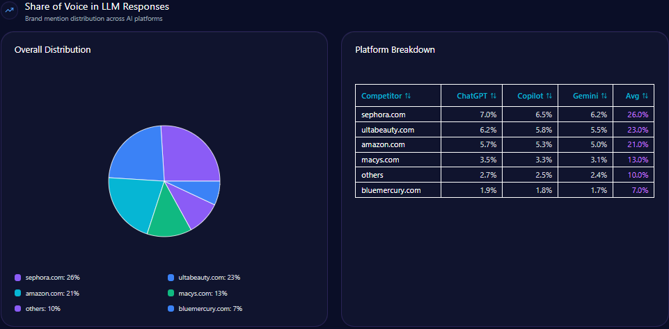 • 163 LLM brand mentions for Sephora representing 26% share of voice, leading competitors including Ulta Beauty and Amazon.