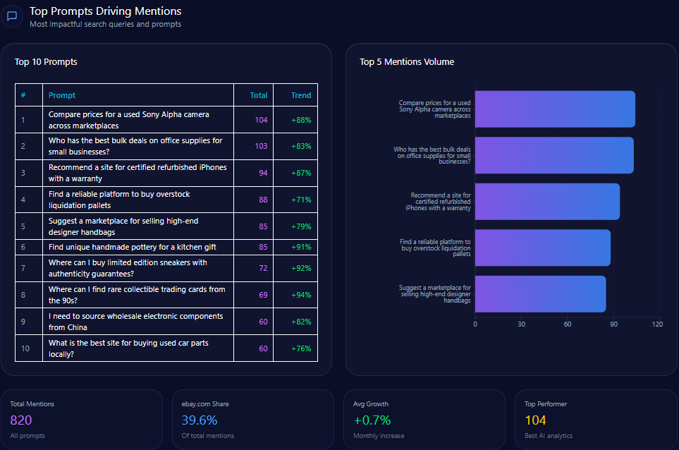 The prompt data highlights eBay’s prominence in collectibles, certified refurbished electronics, and authenticity-verified luxury goods, while competitive edges persist in wholesale and handmade queries.