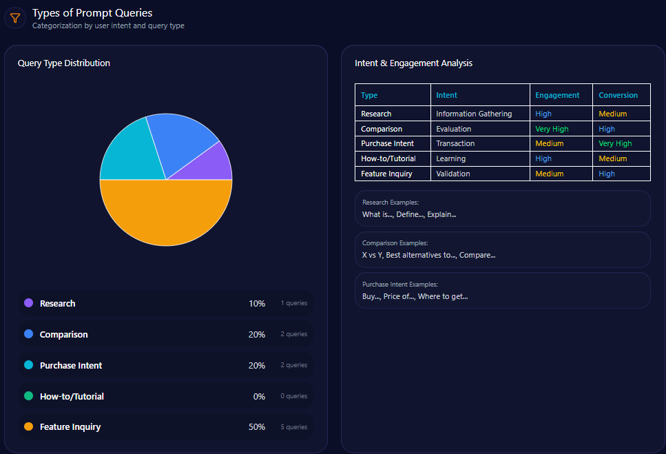 • Research represents 20%, while explicit purchase intent is relatively low at 10%. Notably, How-to/Tutorial queries are absent from the dataset.