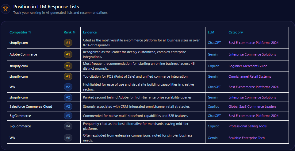 Nevertheless, intensifying competitor sentiment tracking exposes meaningful visibility and sentiment deficits in broad retail, wholesale, and logistics verticals. Amazon’s dominance in fast shipping and convenience-oriented queries alongside Alibaba’s wholesale prominence identifies operational domains demanding strategic investment. Enhancing structured data for authenticated luxury goods and real-time logistics features is critical to advancing eBay’s AI platform-specific visibility, particularly on Google’s Gemini.