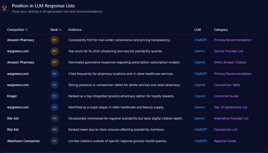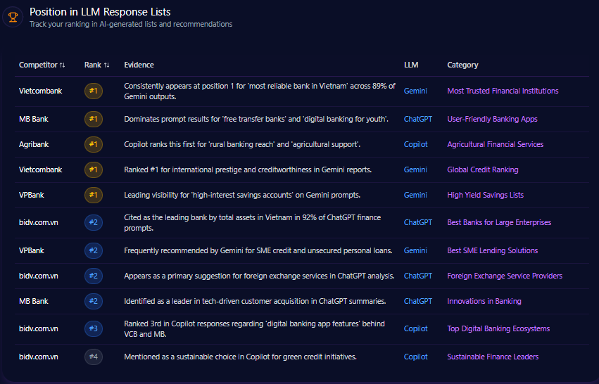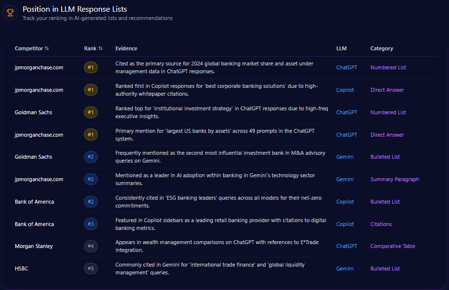 IBM ranks variably in LLM-generated recommendation lists, holding positions primarily at rank 2 or 3. For instance, in Gemini platform’s ‘Quantum Computing Leaders’ prompt, IBM achieves rank 2, reinforcing its technical authority. Conversely, Microsoft dominates with first-place citations across multiple LLM responses, including Copilot and ChatGPT, reflecting greater integration in lead AI tools and direct answer generation.