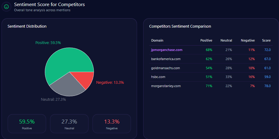 | Brand | Positive % | Neutral % | Negative % | Overall Score |