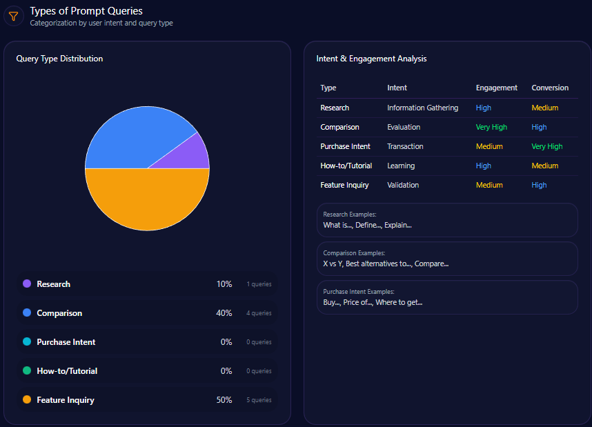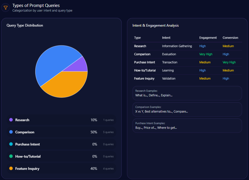 - Feature Inquiry: 40% of prompt types, indicating strong product-specific information flow